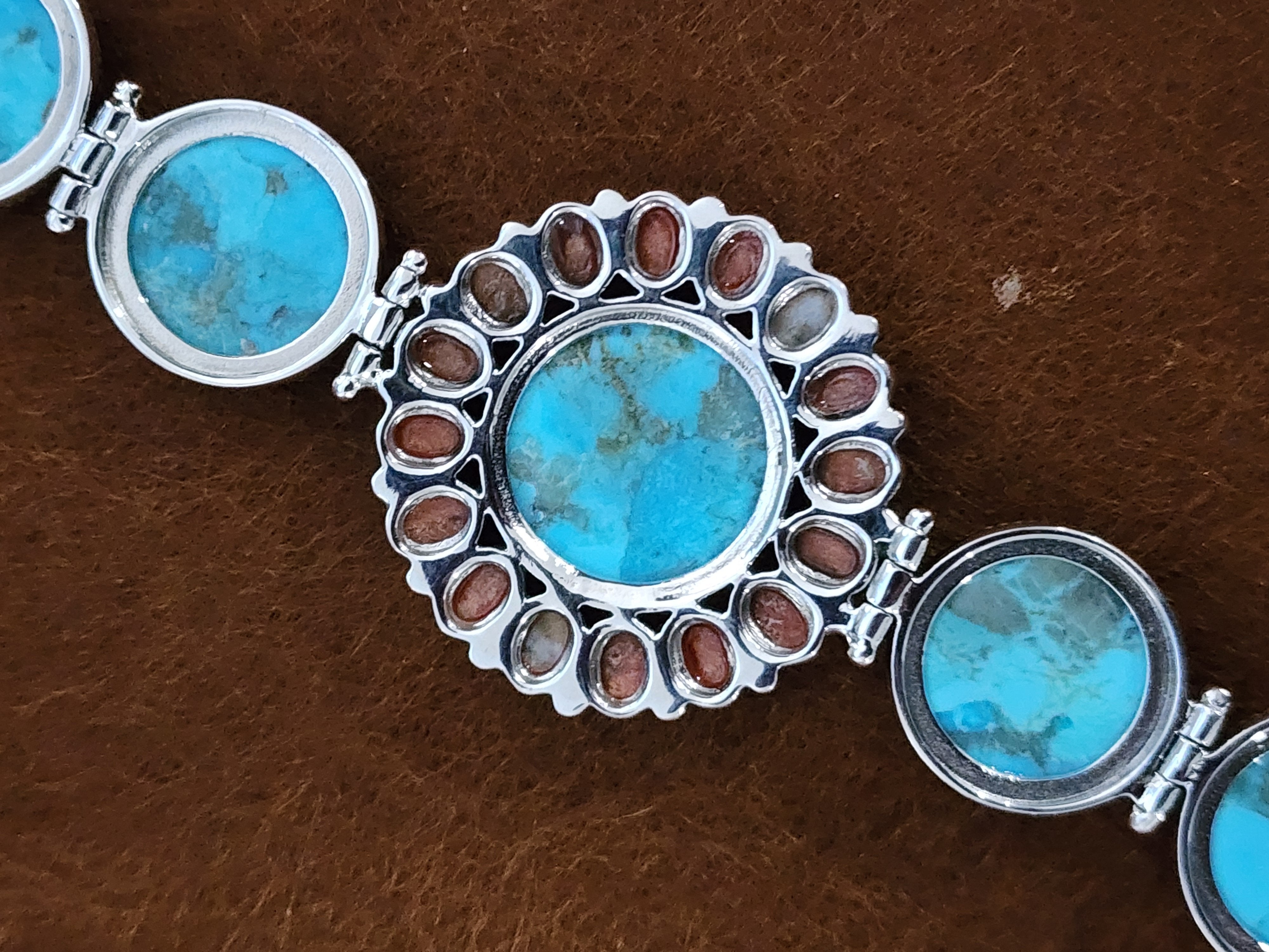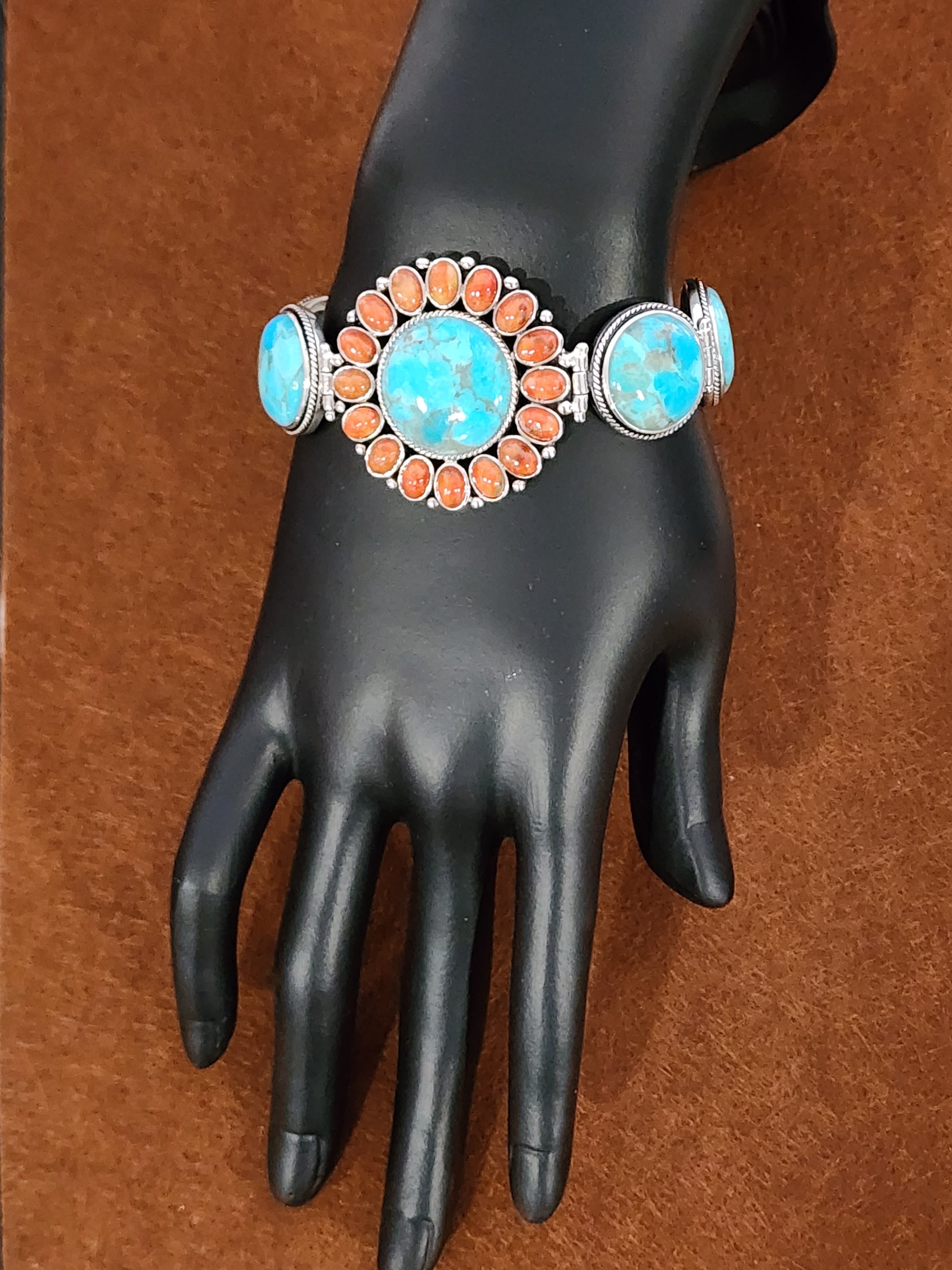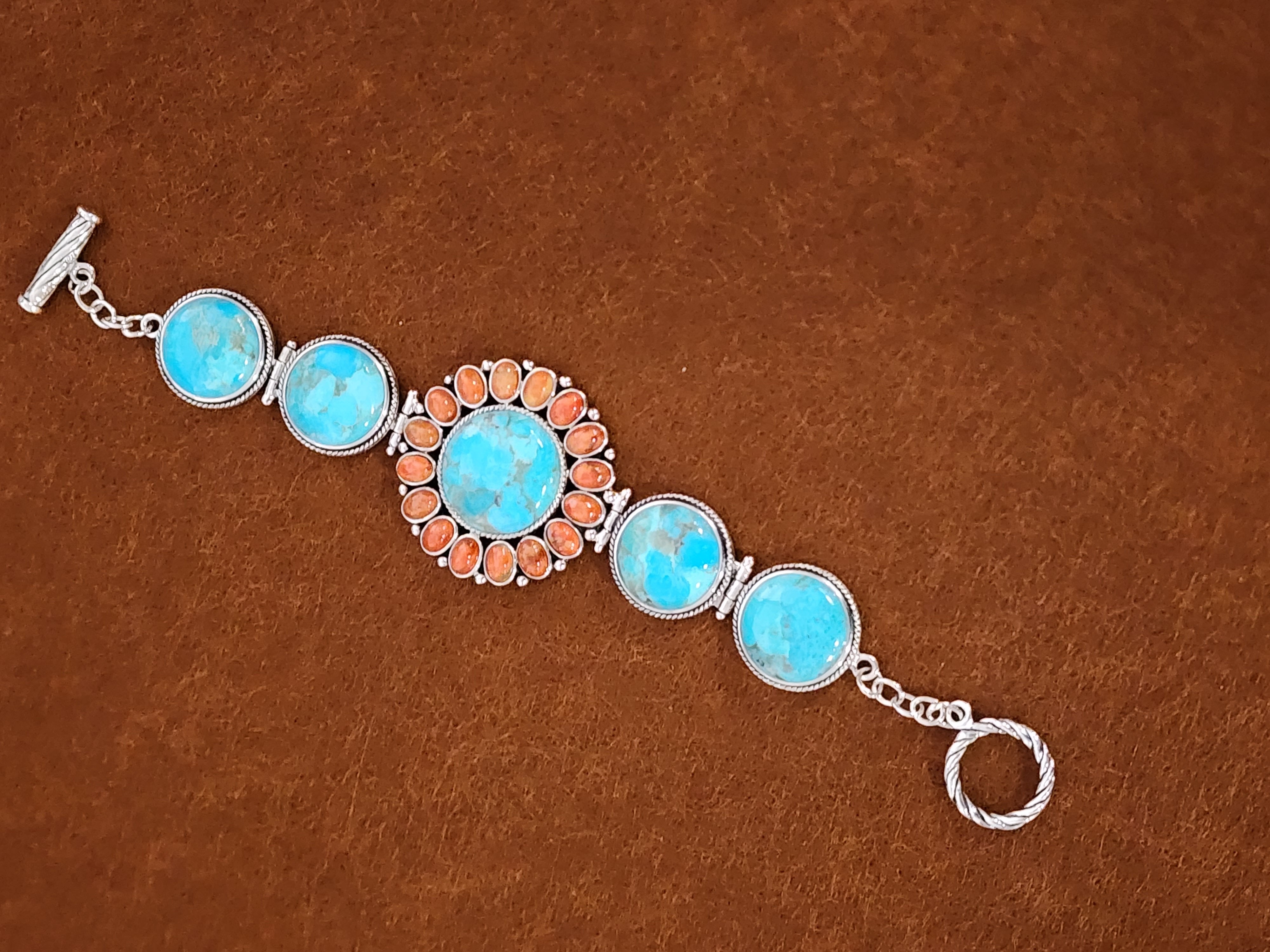 Pretty Southwestern Sunburst/Sunflower design 7.5" long.  Oxidized Sterling Silver toggle bracelet with reconstituted Turquoise and Orange Coral. There are four 16mm Turquoise stones with an 18mm center Turquoise that's surrounded by 5mm x 6mm Orange Coral.