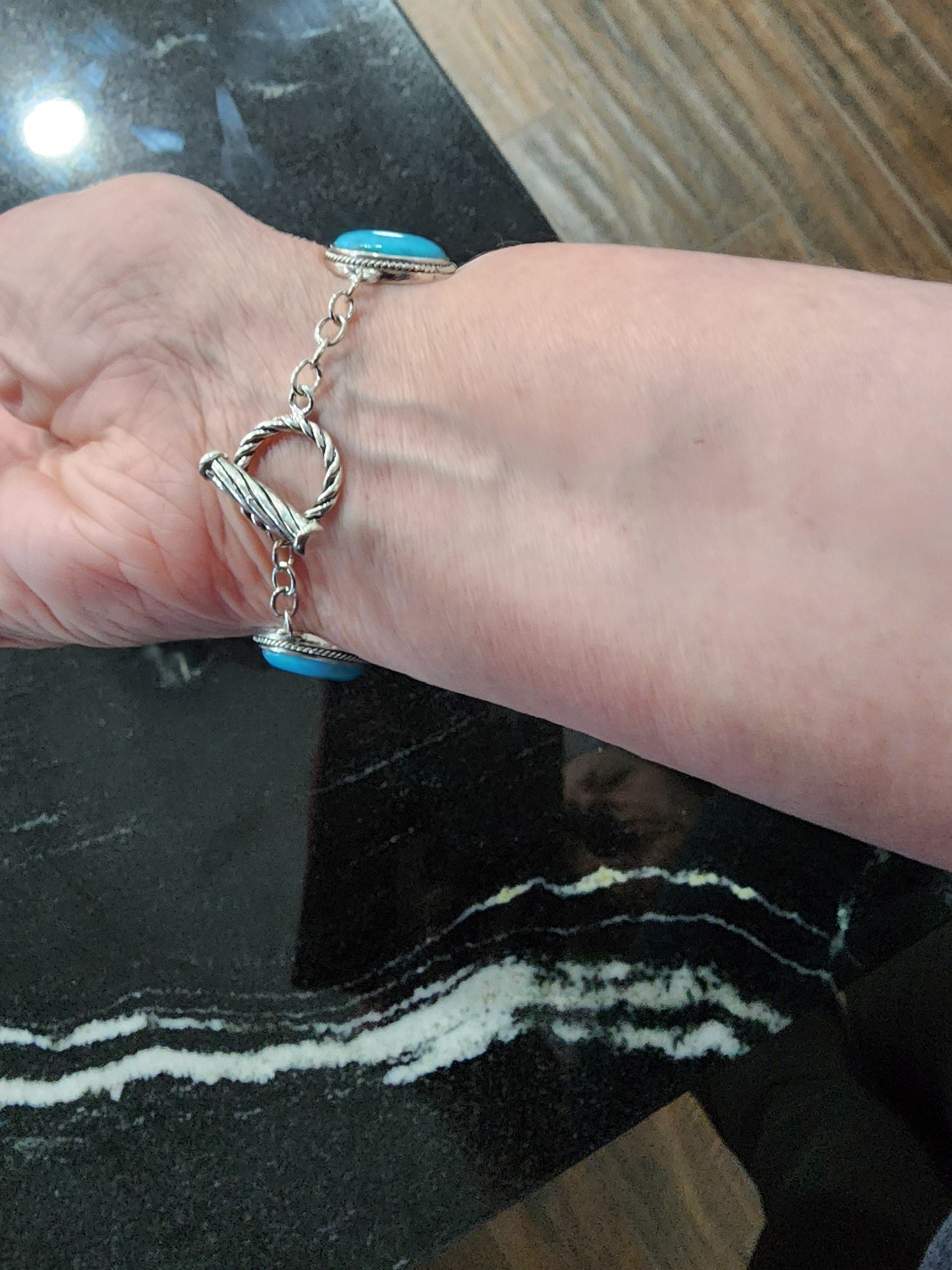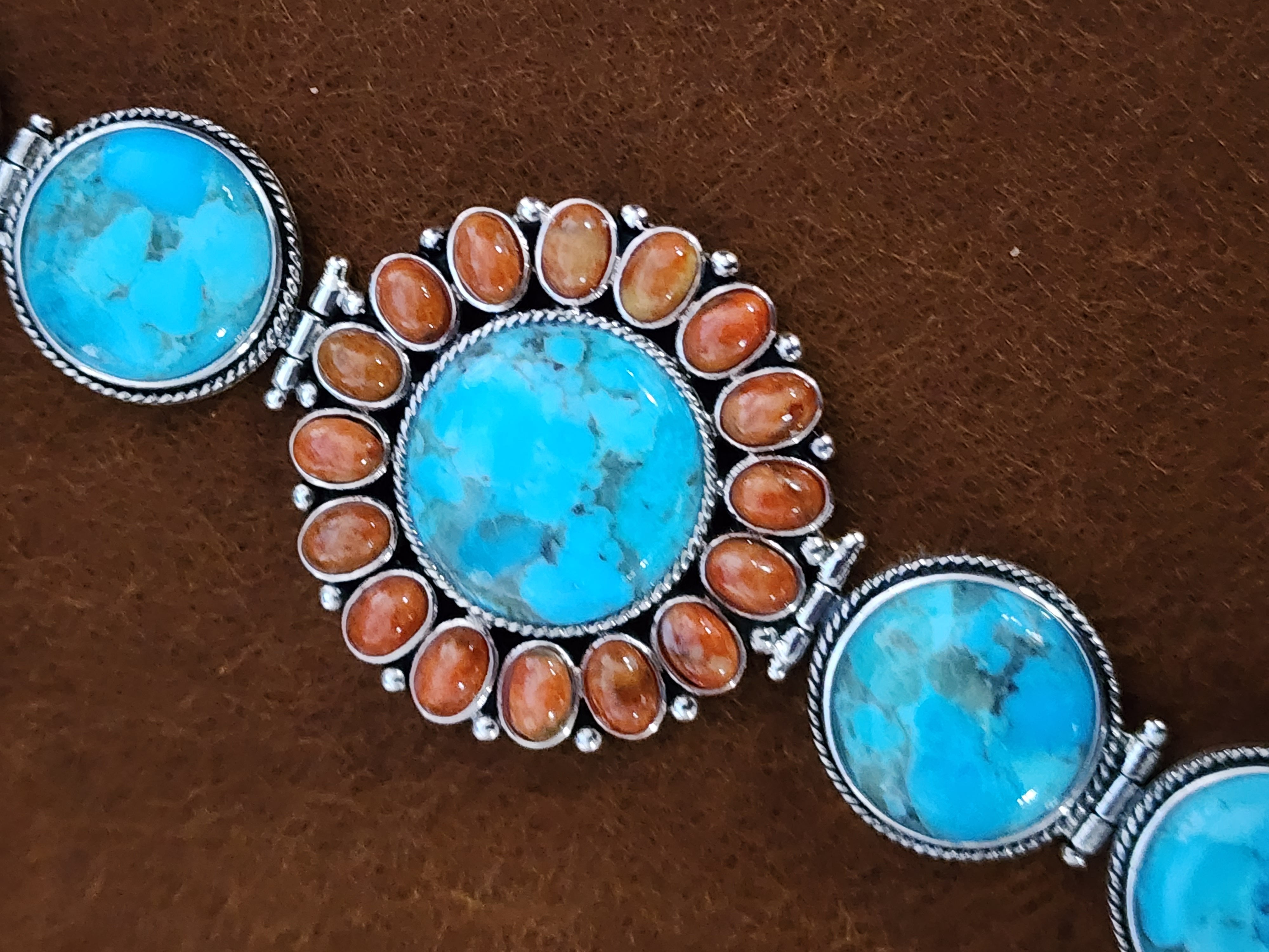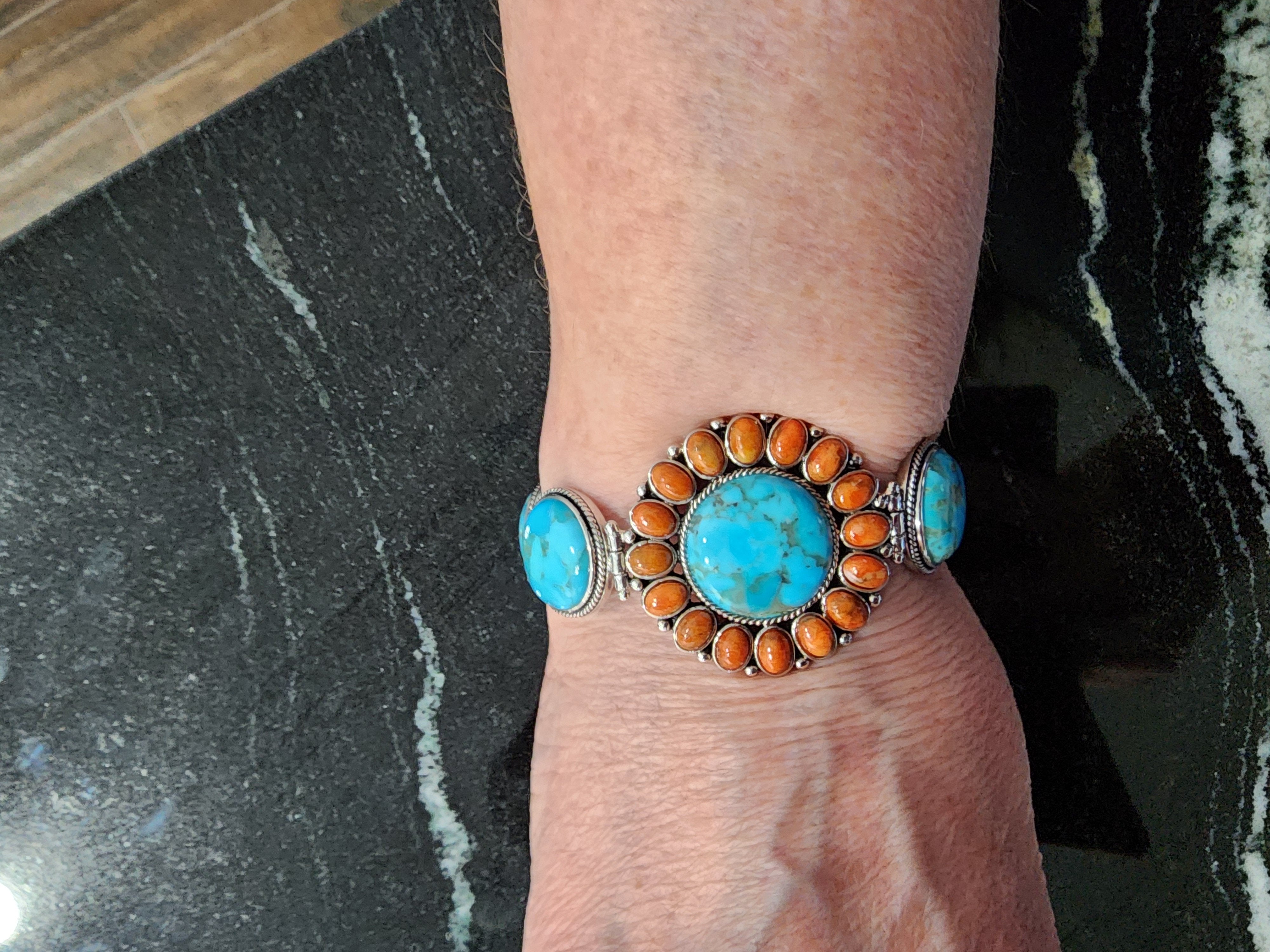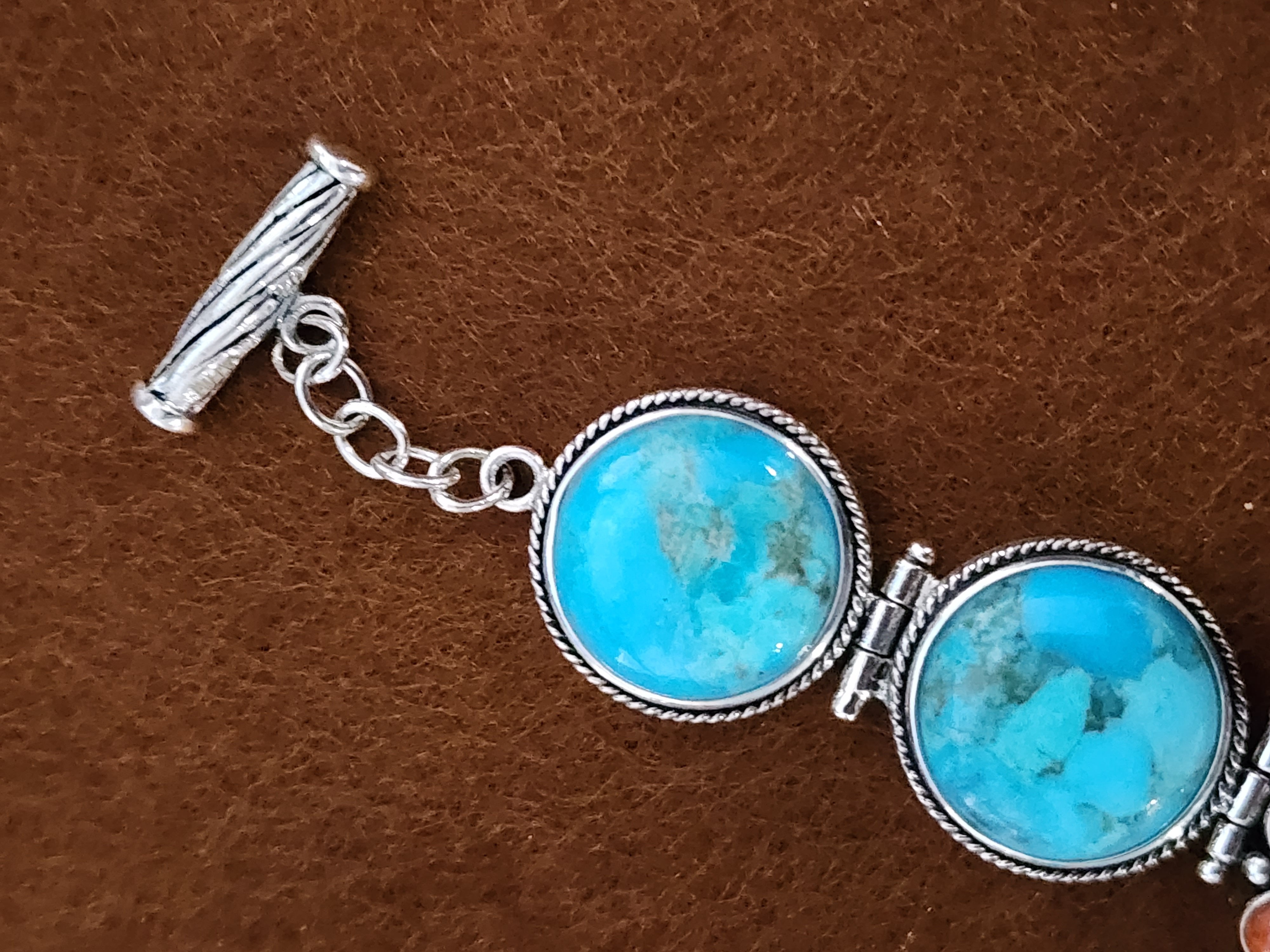 Pretty Southwestern Sunburst/Sunflower design 7.5" long.  Oxidized Sterling Silver toggle bracelet with reconstituted Turquoise and Orange Coral. There are four 16mm Turquoise stones with an 18mm center Turquoise that's surrounded by 5mm x 6mm Orange Coral.