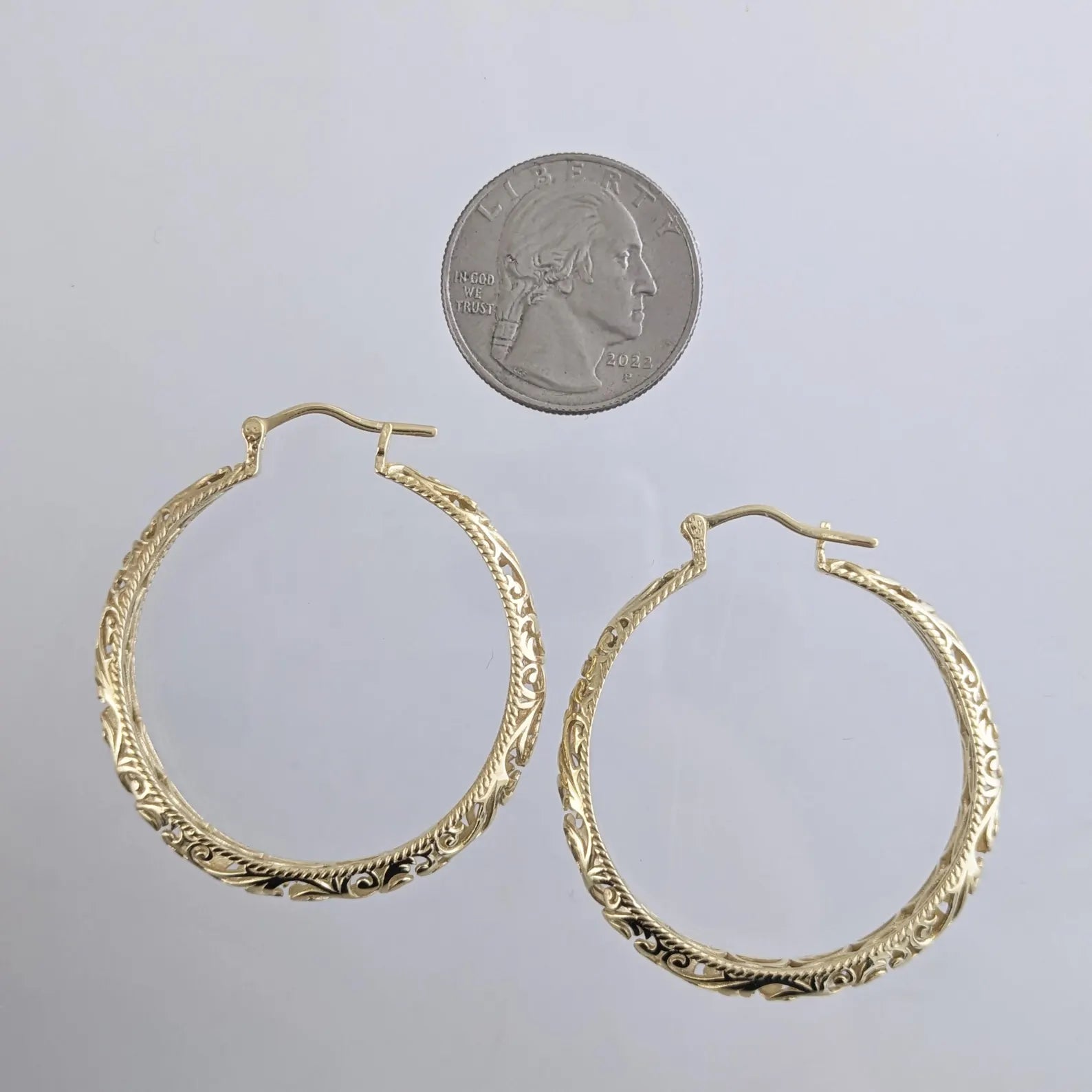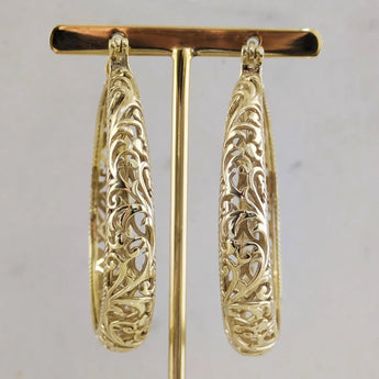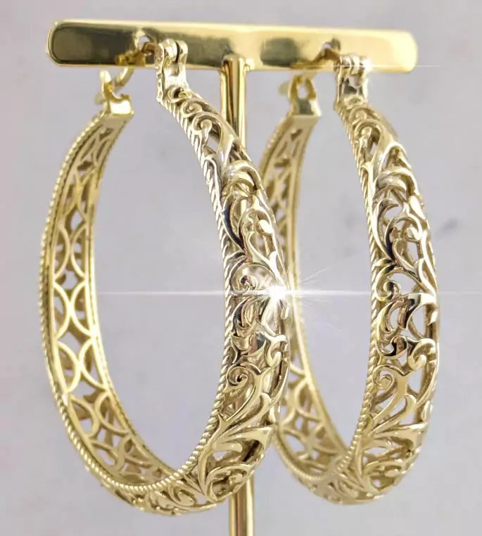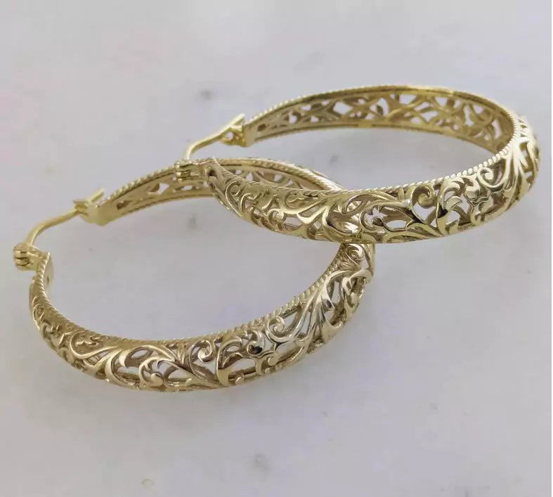 Large graduated hoop earrings with Unique open scrollwork detailing, handcrafted and finished in 18k gold over bronze. Lightweight statement earrings bring instant glamor and comfort to any outfit.